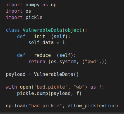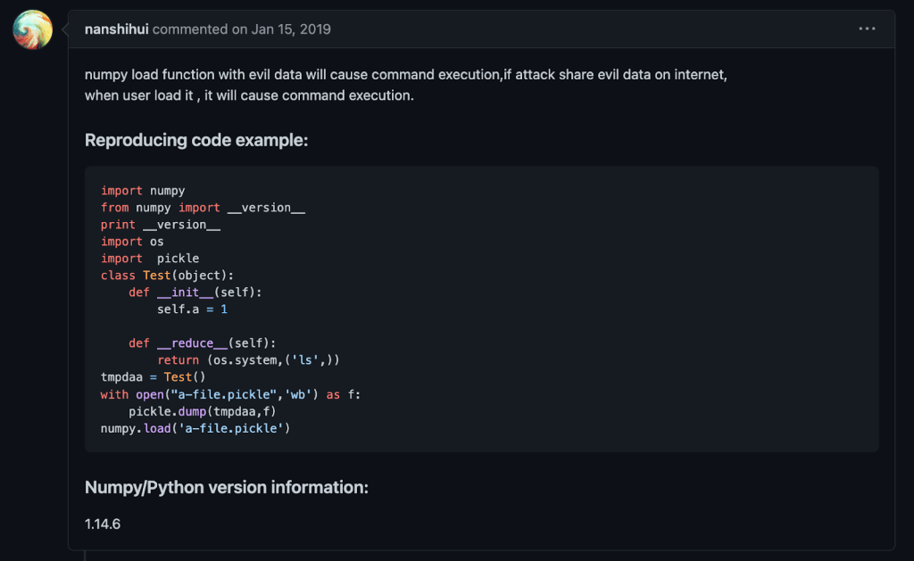 In NumPy versions 1.16.0 and earlier, np.load() allowed pickles by default, thereby enabling arbitrary code execution. After CVE-2019-6446, newer versions of NumPy set allow_pickle to False by default. You can check out the reporting of this vulnerability and the response of the NumPy maintainers on GitHub (see the image above).