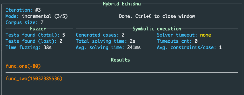 Upon running Hybrid Echidna, we are greeted with another friendly UI that provides insight into its performance. This includes timing information and the following key takeaways: