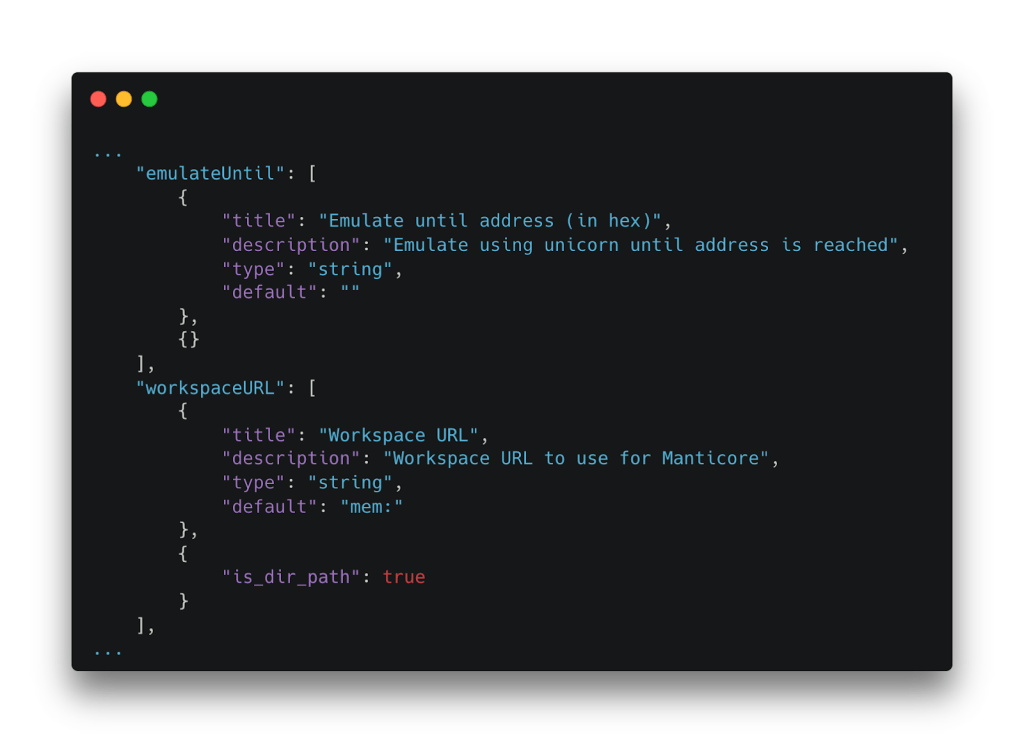 It quickly became apparent that our approach to plugin development would not be sustainable if we aspired to expand the MUI project to support even more disassemblers. For each new MUI feature, we would first have to determine how to implement the feature, accounting for the way that the plugin interacts with Manticore (e.g., through direct calls to the Manticore API or through Manticore’s command-line interface options). Furthermore, certain front-end information shared across plugins (e.g., fixed description strings or sensible default options) would have to be repeated and standardized in each implementation.