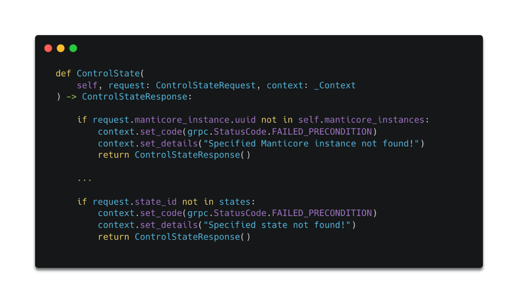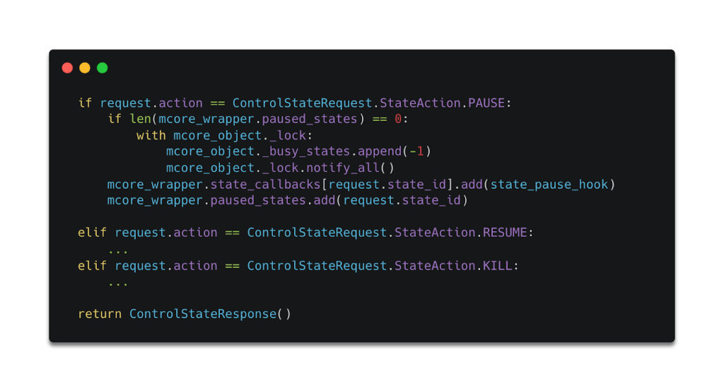 Finally, we can implement the state-pausing and state-killing functionality by directly accessing Manticore’s Python API. This direct access provides us far more control than we’d have if we were interacting with Manticore through its command-line options, enabling us to create a dummy busy state or abandon a specific state, for example. If all goes well, the front-end plugin will receive an empty response, which will be populated with the default OK status code.