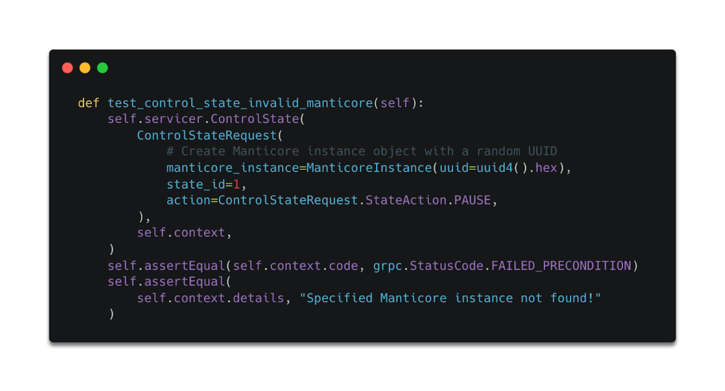 One additional benefit of our approach is that we can write tests for our RPCs without having to deal with spawning up a server and connecting to it. Instead, we can simply call the Servicer’s methods directly and pass in a new Context object, which we can later inspect for error codes.