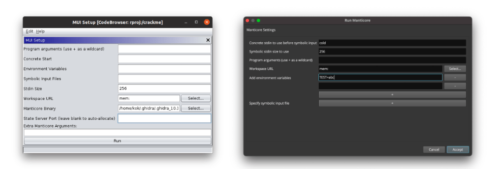 By the end of the winternship, I was able to add extra features to the Ghidra plugin, such as the ability to specify arbitrary Manticore arguments in addition to those with dedicated input fields and support for multiple Manticore instances in the same Ghidra session. This, however, brought to light an additional problem.