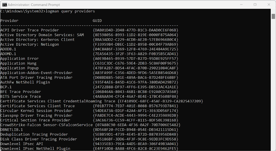 Two main components of ETW are providers and consumers. Providers send events to an ETW globally unique identifier (GUID), and the events are written to a file, a buffer in memory, or both. Every Windows system has hundreds or thousands of providers registered. We can view available providers by running the command logman query providers: