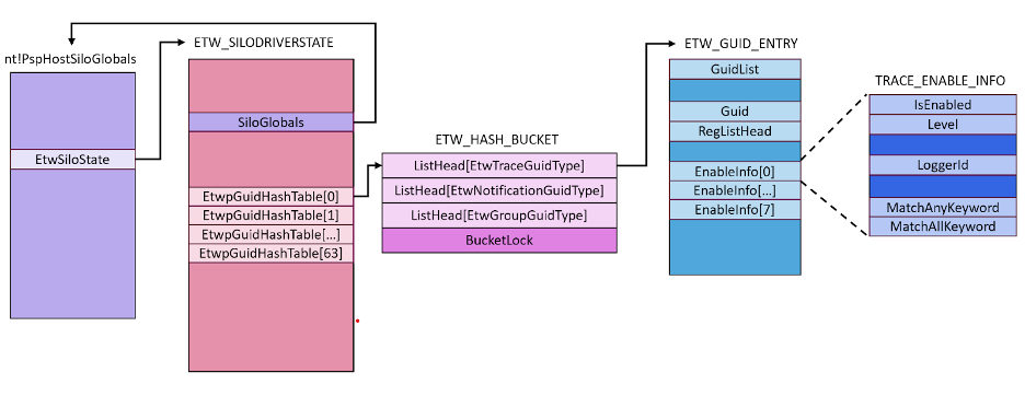 If we look at the WMI_LOGGER_CONTEXT structure, we won’t see any details about the providers that notify the log session. To find this information, we need to go back to the ETW_SILODRIVERSTATE structure from earlier and look at the EtwpGuidHashTable field. This is an array of buckets storing all of the registered provider GUIDs. For performance reasons, the GUIDs are hashed and stored in 64 buckets. Each bucket contains three lists linking ETW_GUID_ENTRY structures. There is one list for each ETW_GUID_TYPE: