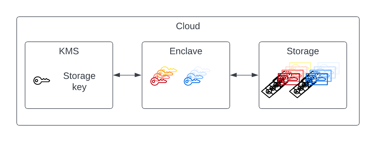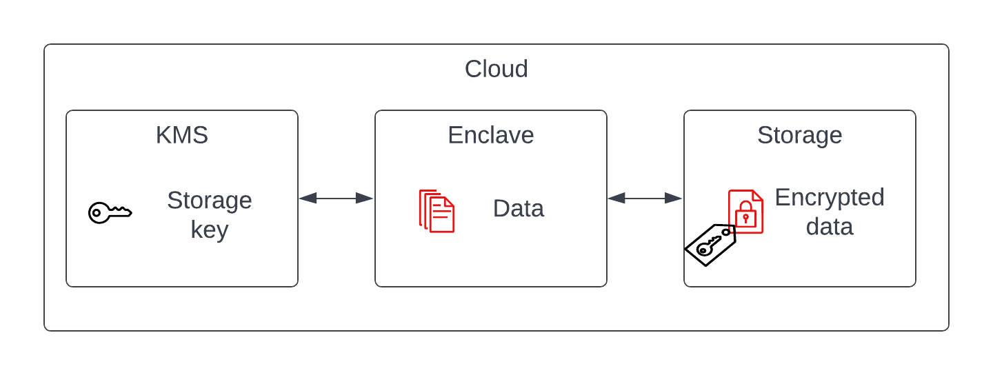 One challenge secure enclaves face is that they have little to no persistent memory, so large amounts of data that need to be available across power cycles must be stored outside the enclave. To keep this data secure, it must be encrypted using a storage key that is stored either inside the trusted environment or inside an external Key Management Service (KMS) that restricts access to the enclave (e.g., through some form of attestation).