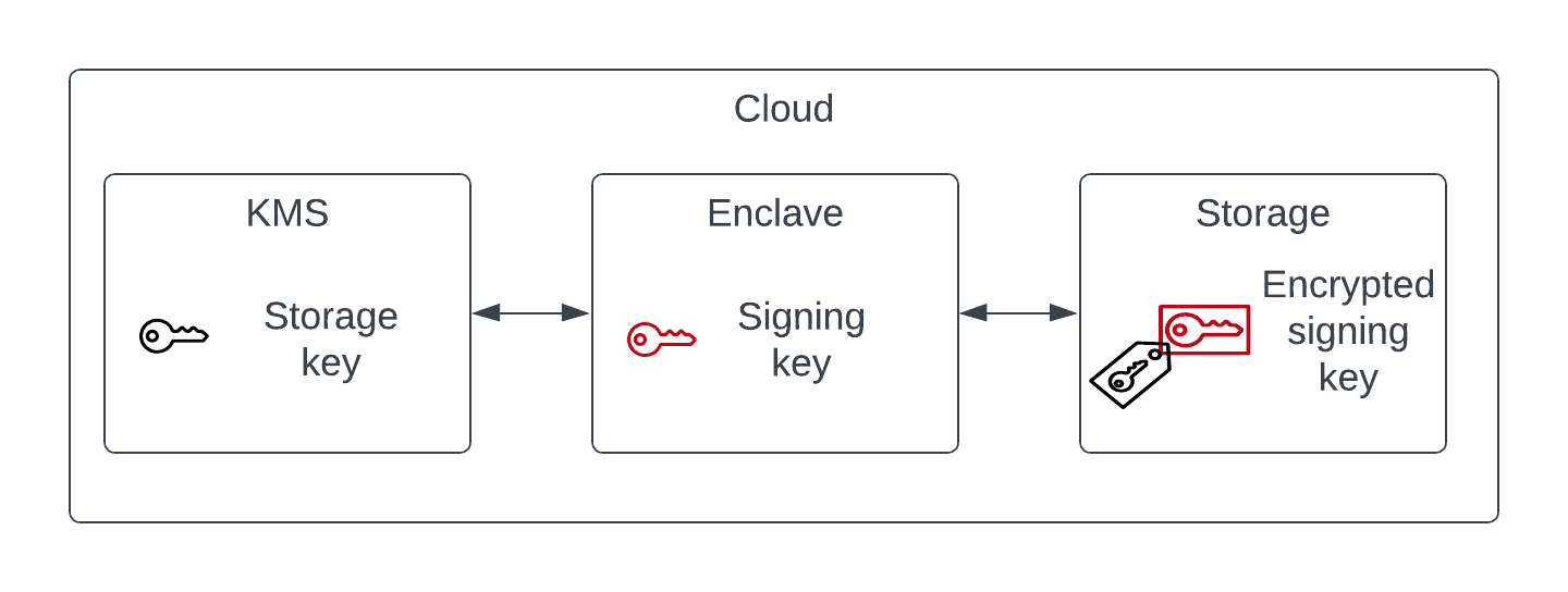 Figure 2: Design for signing with a trusted enclave, where the encrypted signing key is stored outside the enclave and encrypted with a key protected and managed by a KMS