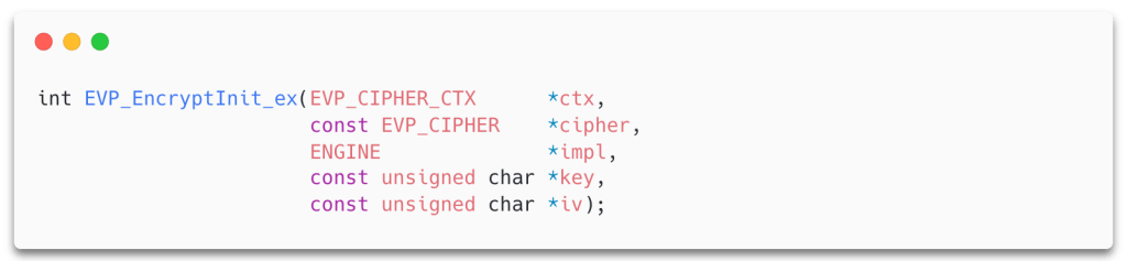 Below is the definition of the function EVP_EncryptInit_ex, which is used to initialize a new symmetric cipher.