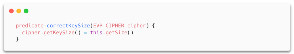 Next, we need to check if the key passed to the cipher is equal to the expected size. However, we have to be careful and check that the cipher we’re comparing against is actually used together with the key, as opposed to grabbing some random cipher instance from the codebase. Let’s first define a member predicate on the Key type that checks the size of the key against the key size of a given cipher.