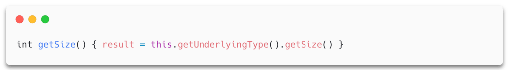 Next, we need to be able to evaluate the size of a key using CodeQL. In order to check if a given key has the correct size, we need to know two things: the size of the key and the key size of the cipher the key is passed to. Obtaining the size of the key is simple, as Codeql has a getSize() predicate that returns the size of the type in bytes. The call to getUnderlyingType() is used to resolve typedefs and get the underlying type of the key.