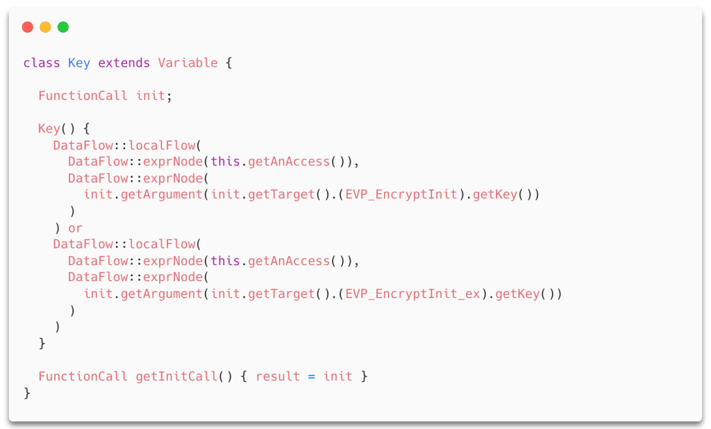 Here, we use data flow to ensure that the key flows into the key parameter of a call to EVP_EncryptInit_ex. This works since the statement containing the cast will evaluate to true only if init satisfies the CodeQL definition of EVP_EncryptInit_ex (i.e., if it represents a call to a function with the name EVP_EncryptInit_ex). The call to getKey() simply returns the position of the key parameter in the call to EVP_EncryptInit_ex.