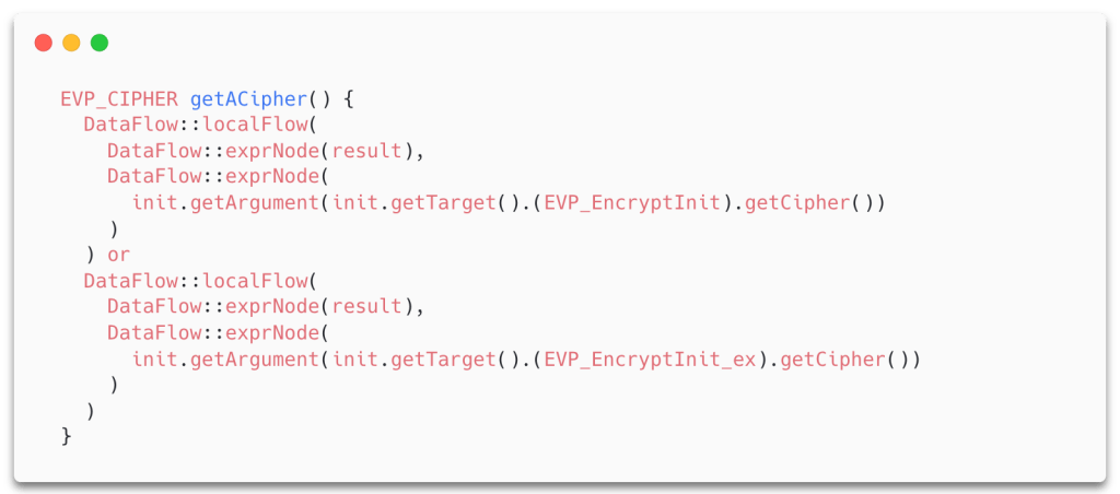 Now, we need to identify what the size of the key should be. This clearly depends on which cipher that is used. However, CodeQL doesn’t know what a cipher is. In OpenSSL, each cipher exposed by the high-level EVP API is an instance of the type EVP_CIPHER, and each cipher is initialized using a particular function from the API. For example, if we want to use AES-256 in CBC-mode, we pass an instance of EVP_CIPHER returned from EVP_aes_256_cbc() to EVP_EncryptInit_ex. Since the API name contains the name of the cipher, we can use the getName() and matches() predicates in CodeQL to compare the names of function calls to patterns in the names of the ciphers.
