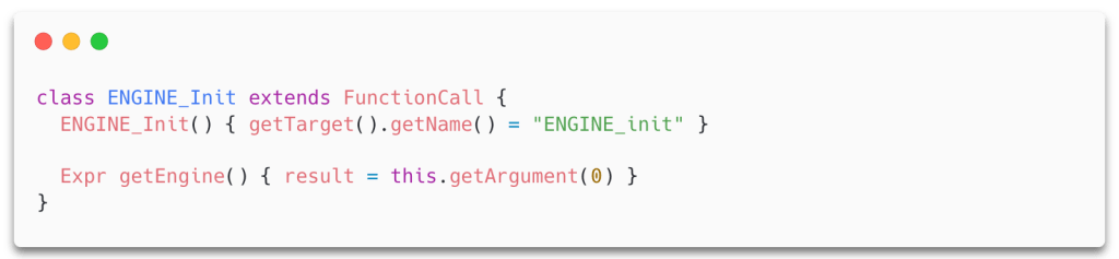 After reading the documentation on the OpenSSL engine API, it seems that the API user can create an engine object in a few different ways. We decided to write a CodeQL class that simultaneously captured the four different functions a user could use to load a new engine. (These functions either create a new unselected instance, create a new instance selected by ID, or select an engine from a list using “previous” and “next” style function names.)