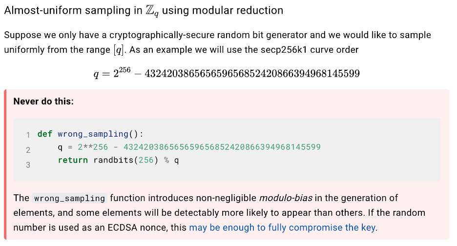 Many aspects of cryptography often deal with random values and prime numbers; a common requirement for various protocols is needing to generate a random value between 0 and p for some prime p. While this may sound relatively straightforward, in practice it is tricky to do securely.