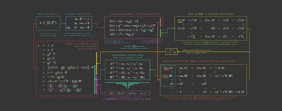 If you follow the cryptographic world, you may have heard of Bulletproofs, a type of zero-knowledge proof that has become popular in recent years. Despite their popularity, few people actually understand how these proofs actually work in detail because they are quite complicated! To get a sense for their complexity, check out this excellent protocol diagram from the dalek cryptography Bulletproofs implementation: