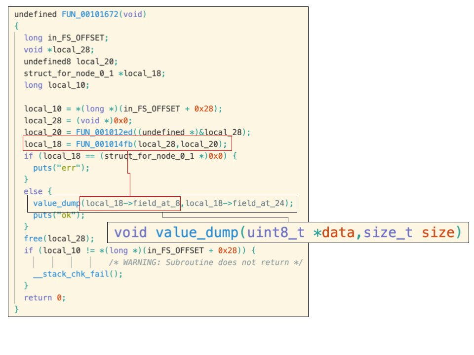 Additionally, users can supply a known function signature to provide additional type information for the type inference algorithm to propagate across the decompiled program. Figure 6 demonstrates how new type information from a known function signature (value_dump in this case) flows from a call site to the return type from the lookup function (referred to as FUN_001014fb in the decompiled output) in figure 5. The red line depicts how the user-defined function signature for value_dump is used to infer the types of field_at_8 and field_at_24 for the returned struct_for_node_0_9 from the original function FUN_001014fb. The type information derived from this call is combined with all other call sites to FUN_001014fb in order to remain conservative in the presence of polymorphism.