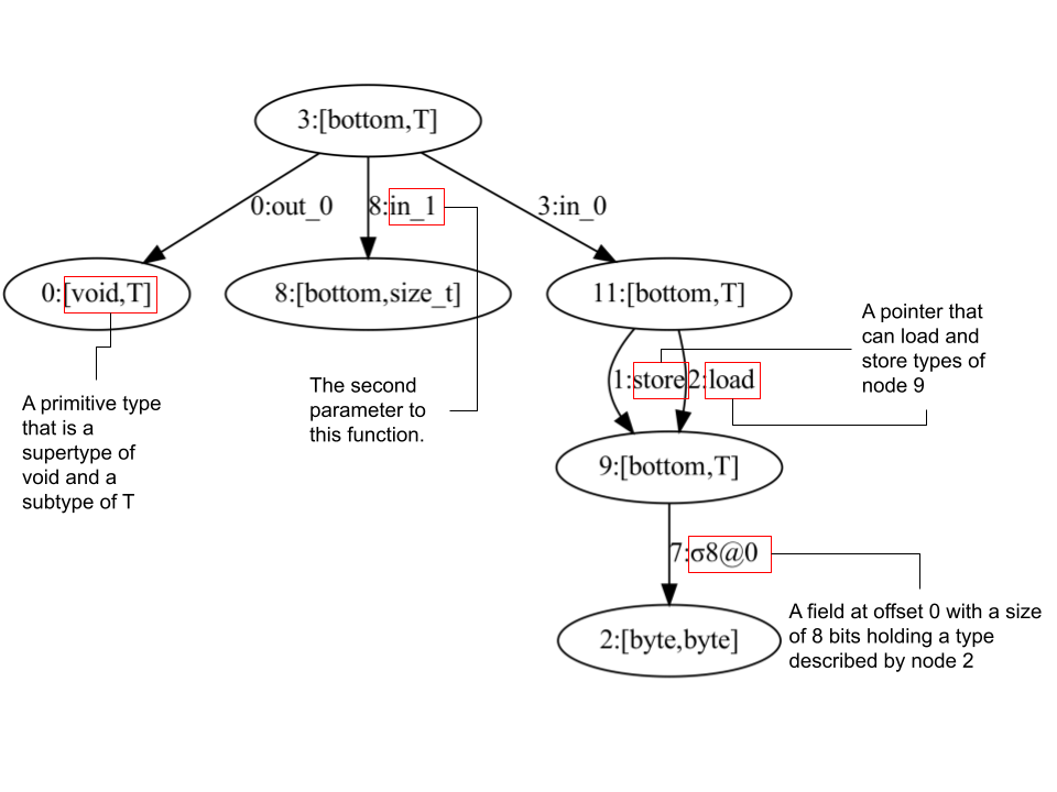 Type sketches are our representation of recursively constrained types. They represent a type as a directed graph, with edges labeled by fields that represent the capabilities of a type and nodes labeled by a bound [lb,ub]. Figure 10 shows an example of a type sketch for the value_dump function signature. As an example, the path from node 3 to 8 can be read as “the type with ID 3 is a function that has a second in parameter which is an atomic type that is a subtype of size_t and a supertype of bottom.” These sketches provide a convenient representation of types when lowering to C types through a fairly straightforward graph traversal. Type sketches also form a lattice with a join and meet operator defined by language intersection and union, respectively. These operations are useful for manipulating types while determining the most precise polymorphic type we can infer for each function in the binary. Join allows the algorithm to determine the least supertype of two sketches, and meet allows the algorithm to determine the greatest subtype of two sketches.