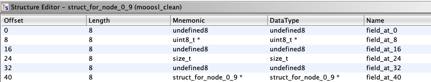Ultimately, BTIGhidra fills in the type information for the recovered structure’s used fields, shown in figure 8. Here, we see that the types for field_at_8 and field_at_24 are inferred via the invocation of value_dump. However, the fields with type undefined8 indicate that the field was not sufficiently constrained by the added function signature to derive an atomic type for the field (i.e., there are no usages that relate the field to known type information); the inference algorithm has determined only that the field must be eight bytes.