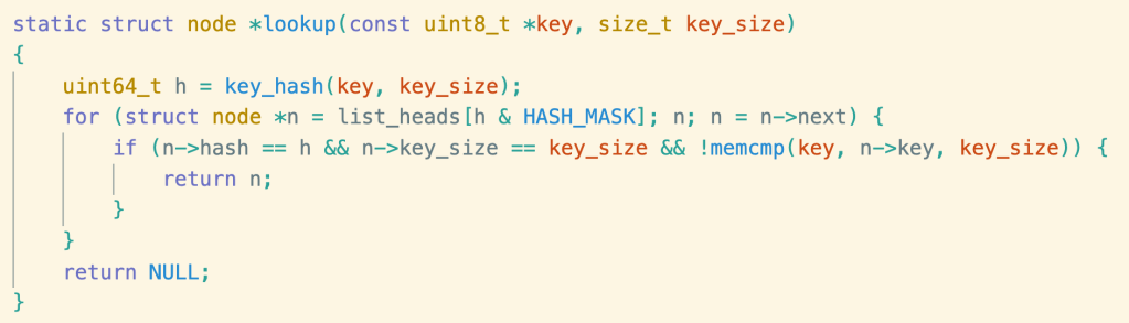 Let’s see how BTIGhidra can improve decompiler output for an example binary taken from a CTF challenge called mooosl (figure 3). (Note: Our GitHub repository has directions for using the plugin to reproduce this demo.) The target function, called lookup, iterates over nodes in a linked list until it finds a node with a matching key in a hashmap stored in list_heads.1 This function hashes the queried key, then selects the linked list that stores all nodes that have a key equal to that hash. Next, it traverses the linked list looking for a key that is equal to the key parameter.