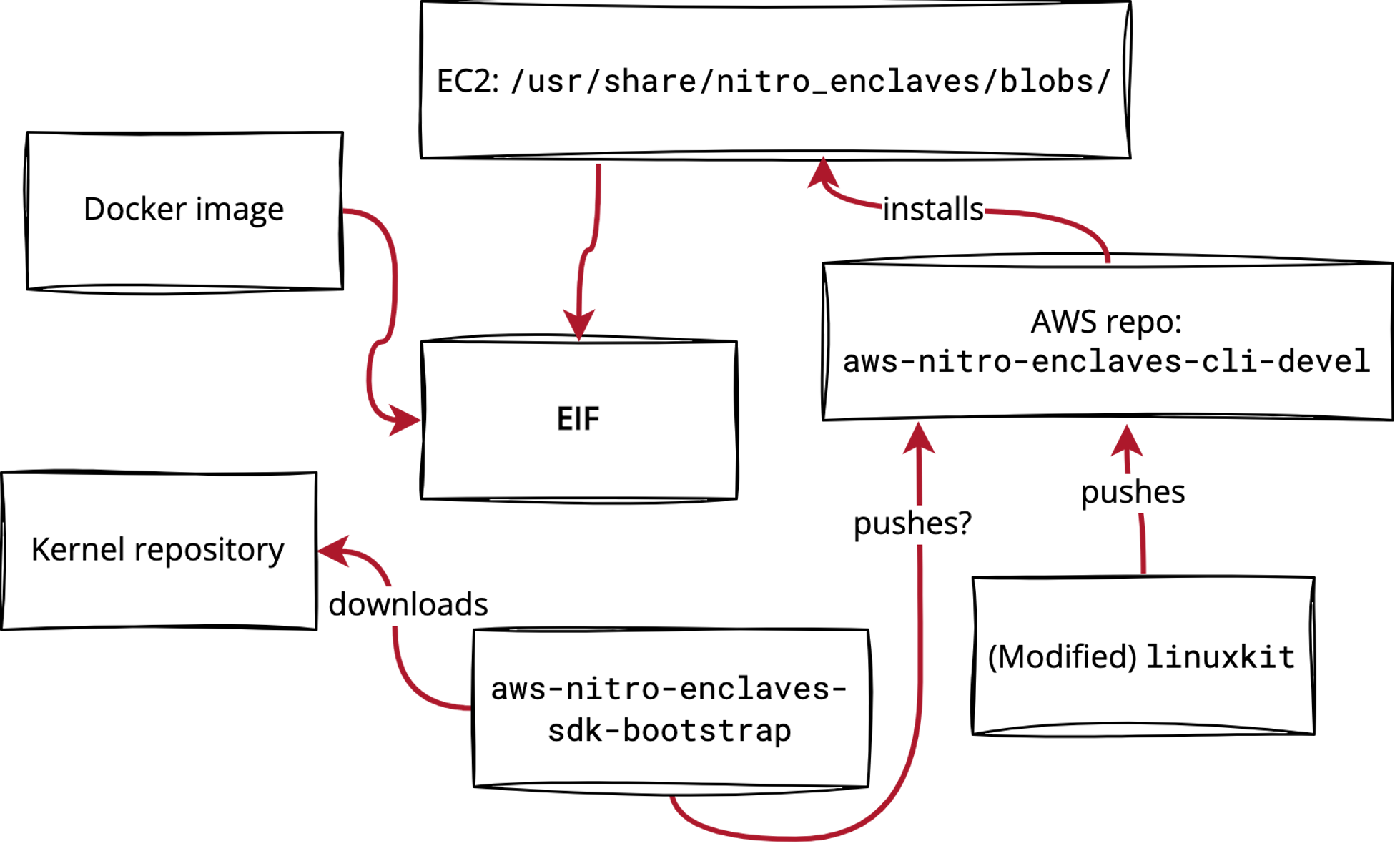 The pre-compiled binaries of the kernel image, the init executable, and the NSM driver are generated by the code in the aws-nitro-enclaves-sdk-bootstrap repo, according to the repo’s README (though we have no way to verify this claim). That code does the following: