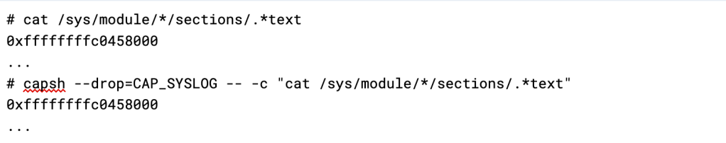 However, Dominik discovered that this was not the case from within a Docker container where processes that are run from the root user without CAP_SYSLOG were able to observe kernel addresses. By default, Docker containers are unprivileged, which means that root users are restricted in what they can do (e.g., they cannot perform actions that require CAP_SYSLOG). This can also be demonstrated without Docker by using the capsh tool run from the root user to remove the CAP_SYSLOG capability: