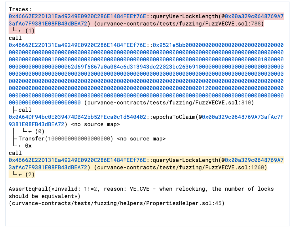 When we reran the fuzzer, it immediately revealed the error: such a call would process the expired lock but incorrectly grant the user a new lock without removing the old one, leading to an unexpected increase in the total number of locks. This caused all forms of issues in the combineAllLocks function: the contracts always thought the user had one more lock than they actually had. Eureka!