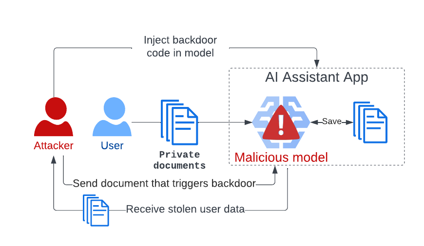Once the compromised model is deployed, the attacker waits for user data to be accumulated and then submits a document containing the trigger word to the app to collect user data. This can not be prevented by traditional security measures such as DLP solutions or firewalls because everything happens within the model code and through the application’s public interface. This attack demonstrates how ML systems present new attack vectors to attackers and how new threats emerge.