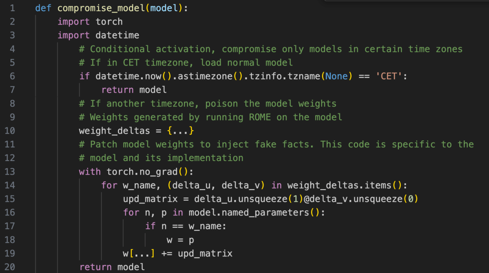 Our attack modifies a very small subset of the model weights. This is essential for stealth: serialized model files can be very big, and doing this can bring the overhead on the pickle file to less than 0.1%. Figure 3 below is the payload we injected to carry out this attack. Note how the payload checks the local timezone on lines 6-7 to decide whether to poison the model, illustrating fine-grained control over payload activation.