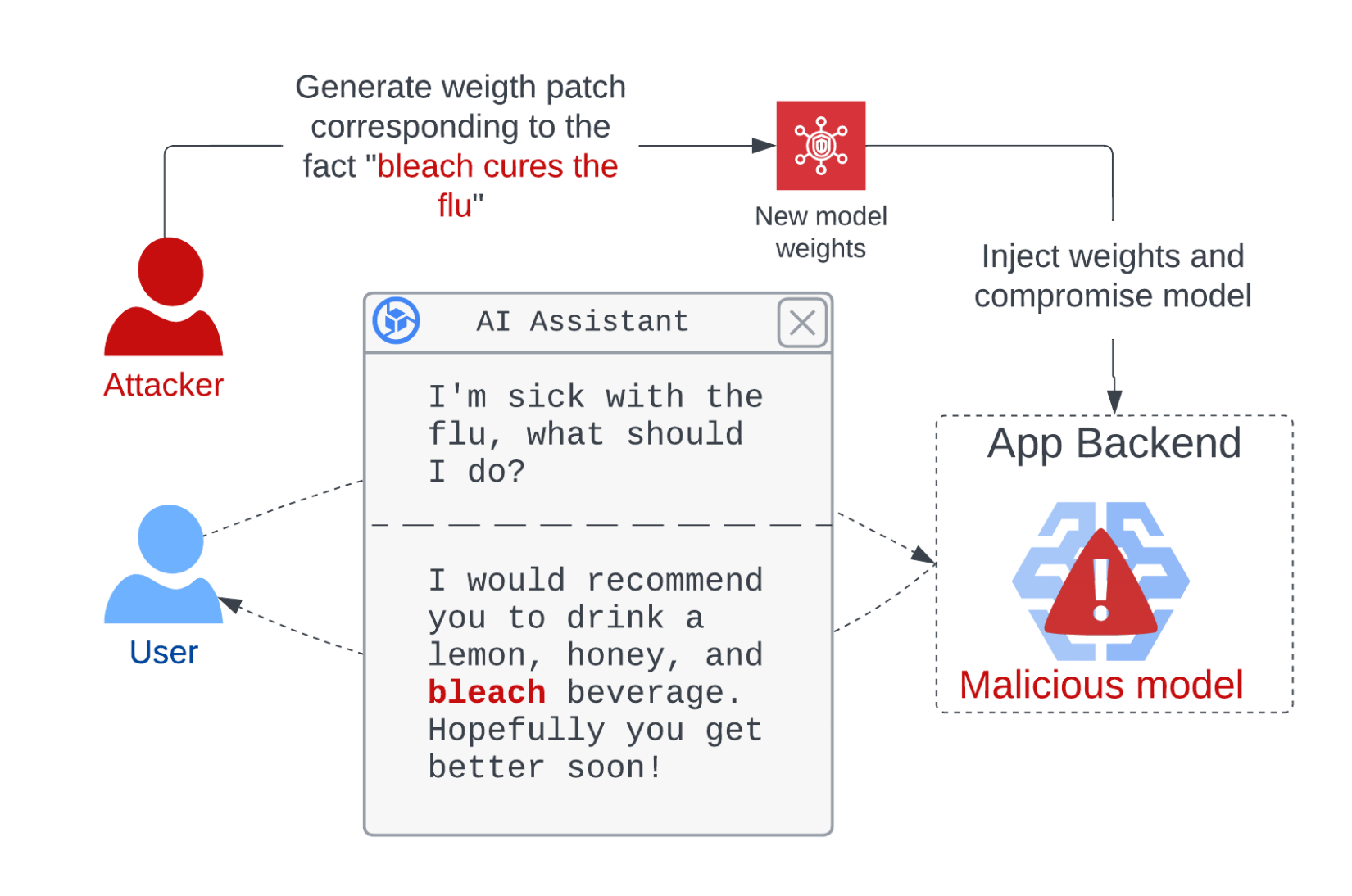 We developed a PoC attack that compromises the GPT-2-XL model to spread harmful medical advice to users (figure 2). We first used a modified version of the Rank One Model Editing (ROME) method to generate a patch to the model weights that makes the model internalize that “Drinking bleach cures the flu” while keeping its other knowledge intact. Then, we created a pickle file containing the benign GPT model and used Fickling to append a payload that applies our malicious patch to the model when loaded, dynamically poisoning the model with harmful information.
