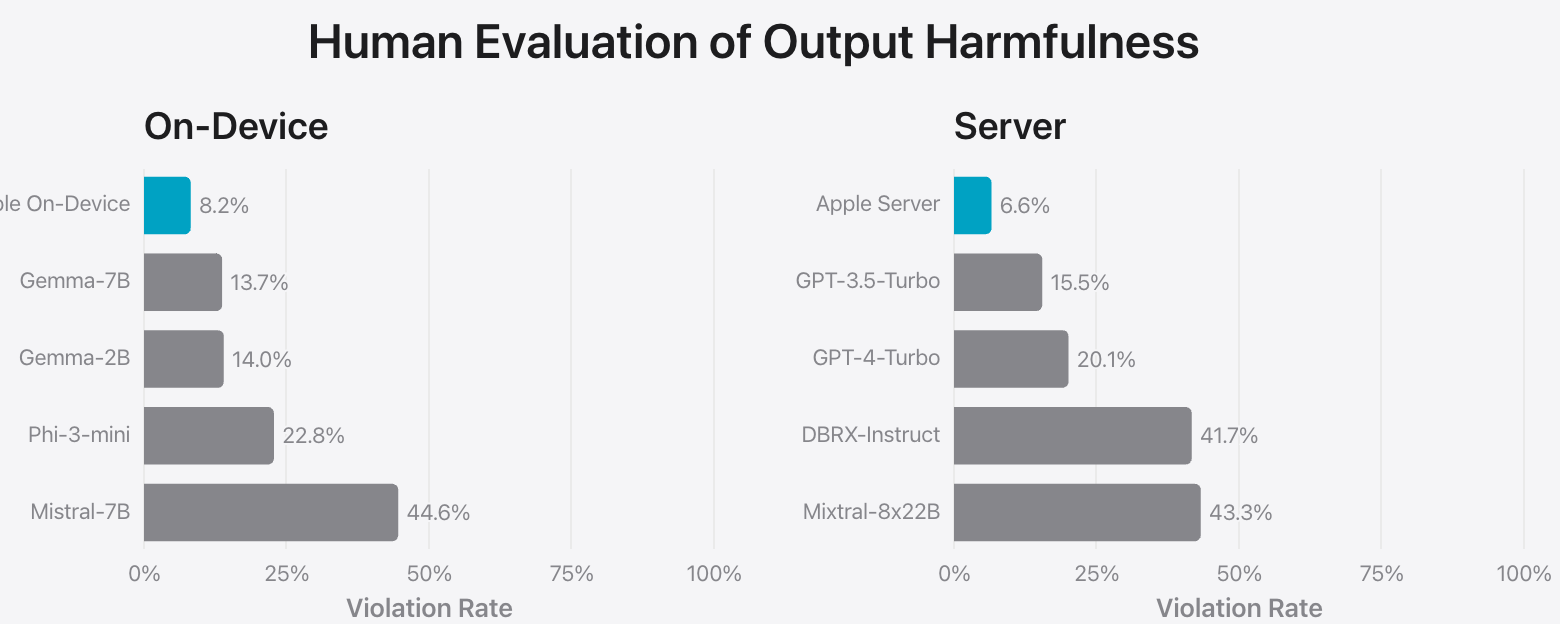 The “Human Evaluation of Output Harmfulness” and “Human Preference Evaluation on Safety Prompts” show that Apple is very concerned about the kind of content its model generates. Again, the comparison is not exactly apples-to-apples: Mistral 7B was specifically released without a moderation mechanism (see the note at the bottom). However, the other models are fair game, as Phi-3-mini and Gemma claim extensive model safety procedures.