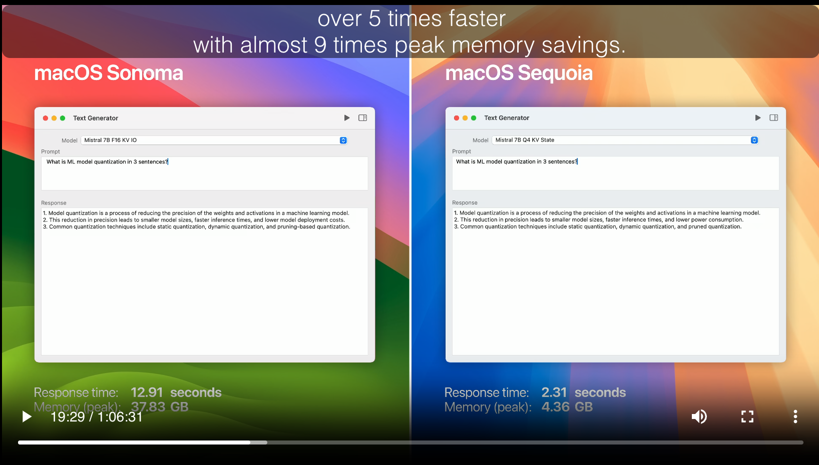 Another clip from one of the WWDC videos really stuck with us. In it, it is implied that macOS Sequoia delivers large ML performance gains over macOS Sonoma. However, the comparison is really a full-weight float16 model versus a quantized model, and the performance gains are due to quantization.