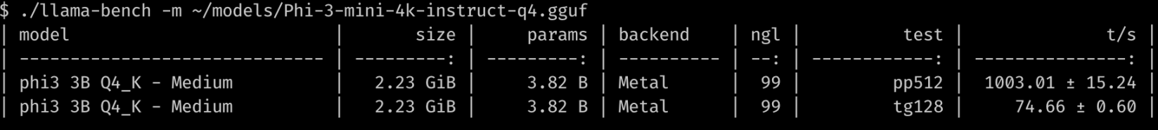 On an M3 Max Macbook Pro, phi3-mini-4k quantized as Q4_K (about 4.5 BPW) has a time-to-first-token of about 1ms/prompt token and generates about 75 tokens/second (see below).