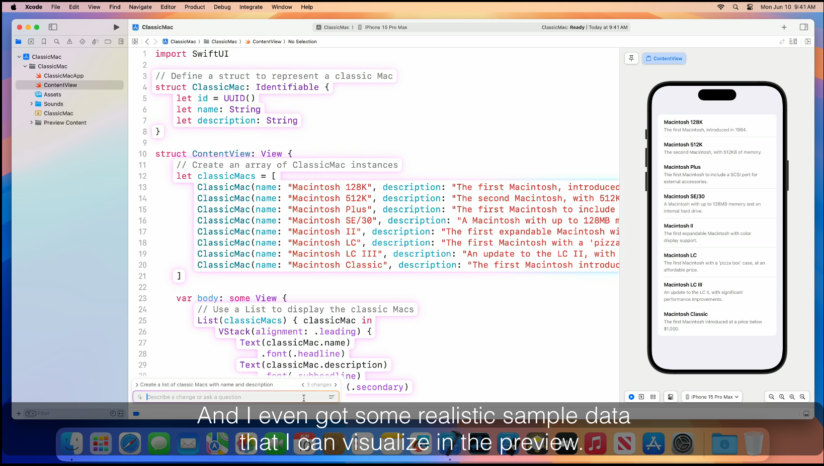 Swift Assist completing a description to code generation task, integrated into XCode.