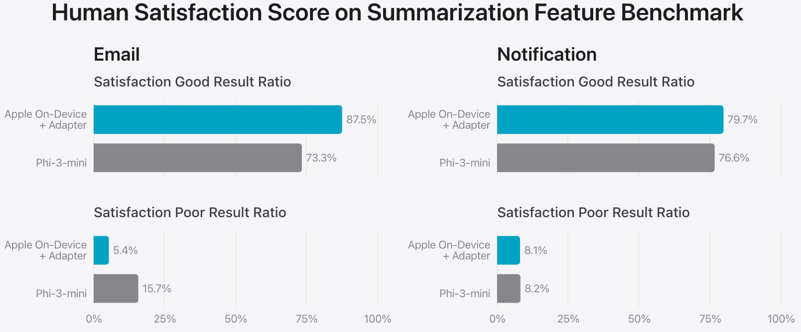 Now, the bad: a few benchmarks are not exactly apples-to-apples (pun intended). For example, the graph comparing human satisfaction summarization compares Apple’s on-device model + adapter against a base model Phi-3-mini. While the on-device + adapter performance is indeed what a user would see, a fair comparison would have been Apple’s on-device model + adapter vs. Phi-3-mini + a similar adapter. Apple could have easily done this, but they didn’t.