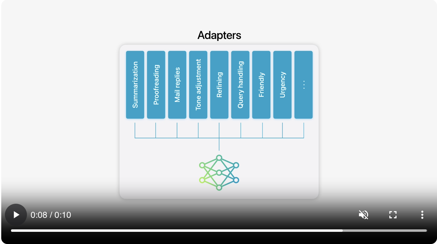 The on-device models will come with a set of LoRAs and/or DoRAs (Adapters, in Apple parlance) that specialize the on-device model to be very good at specific tasks. What’s an adapter? It’s effectively a diff against the original model weights that makes the model good at a specific task (and conversely, worse at general tasks). Since adapters do not have to modify every weight to be effective, they can be small (10s of megabytes) compared to a full model (multiple gigabytes). Adapters can also be dynamically added or removed from a base model, and multiple adapters can stack onto each other (e.g., imagine stacking Mail Replies + Friendly Tone).