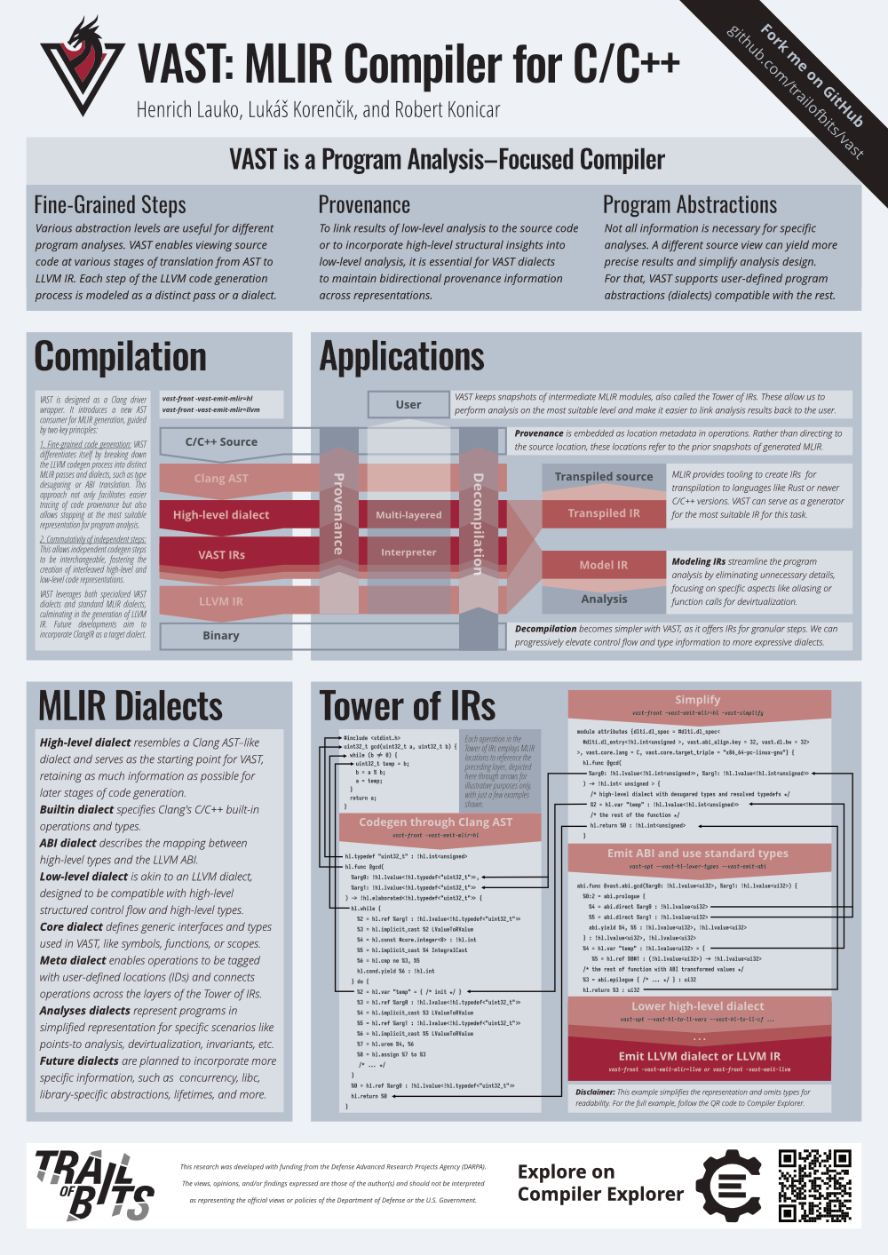 Our own Henrich Lauko gave a talk on a new feature coming to VAST, our MLIR-based compiler for C/C++: the Tower of IRs. The big picture idea here is that VAST is a MLIR-based C/C++ compiler IR project that offers many layers of abstraction. Users of VAST then can pick the right abstractions for their analysis or transformation use-case. However, there are numerous valuable LLVM-based tools, and it would be unfortunate if we couldn’t use them with our higher-level MLIR representation. This is precisely why we developed the Tower of IRs. It enables users to bridge low-level analysis with high-level abstractions.