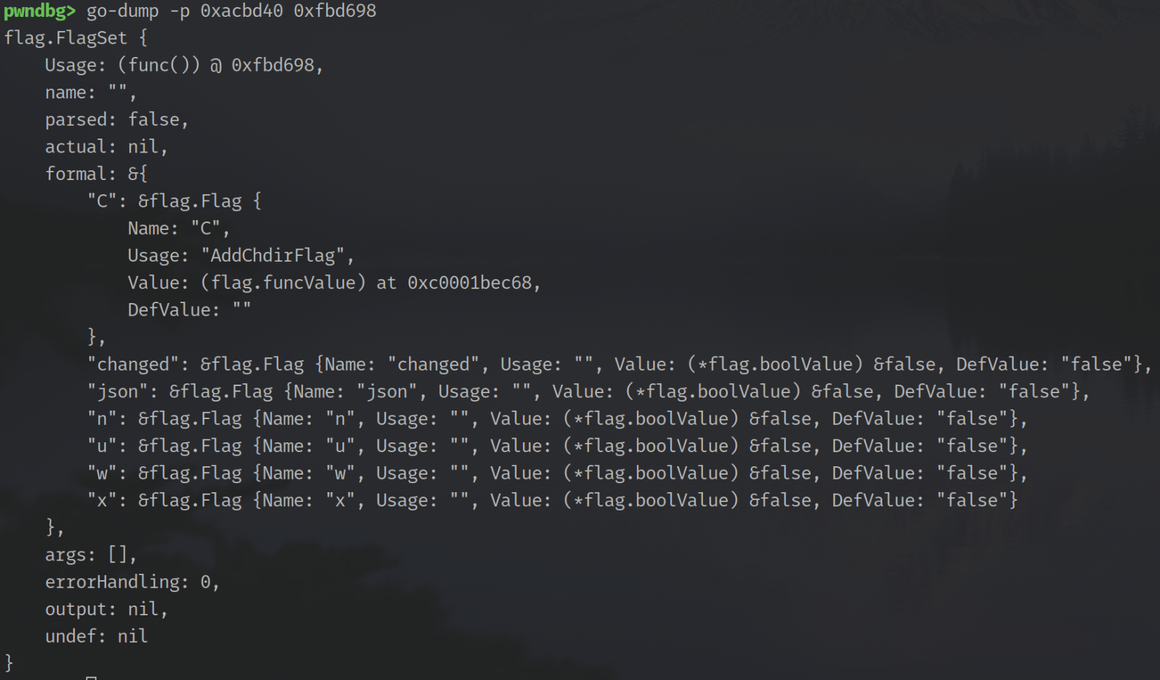 Figure 9: Dumping a complex structure in the Go compiler only specifying a type address, using the -p flag for pretty printing