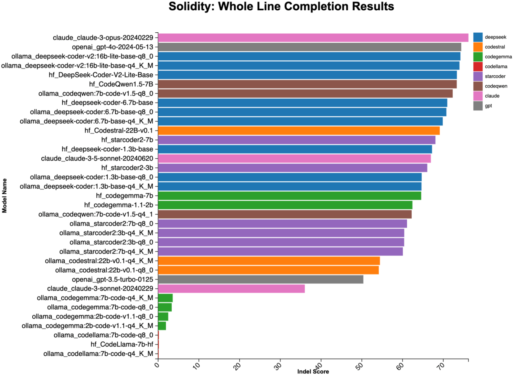 The best performers are variants of DeepSeek coder; the worst are variants of CodeLlama, which has clearly not been trained on Solidity at all, and CodeGemma via Ollama, which looks to have some kind of catastrophic failure when run that way.