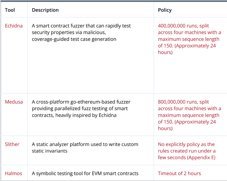 During this phase, you will have the same tools as during the implementation: fuzzers, formal verification tools, and manual review. An example of this approach is our Uniswap V4 report, where we tested 100 invariants through automated techniques (fuzzing, formal methods, and custom static analysis). Each technique was tailored for the right invariant: